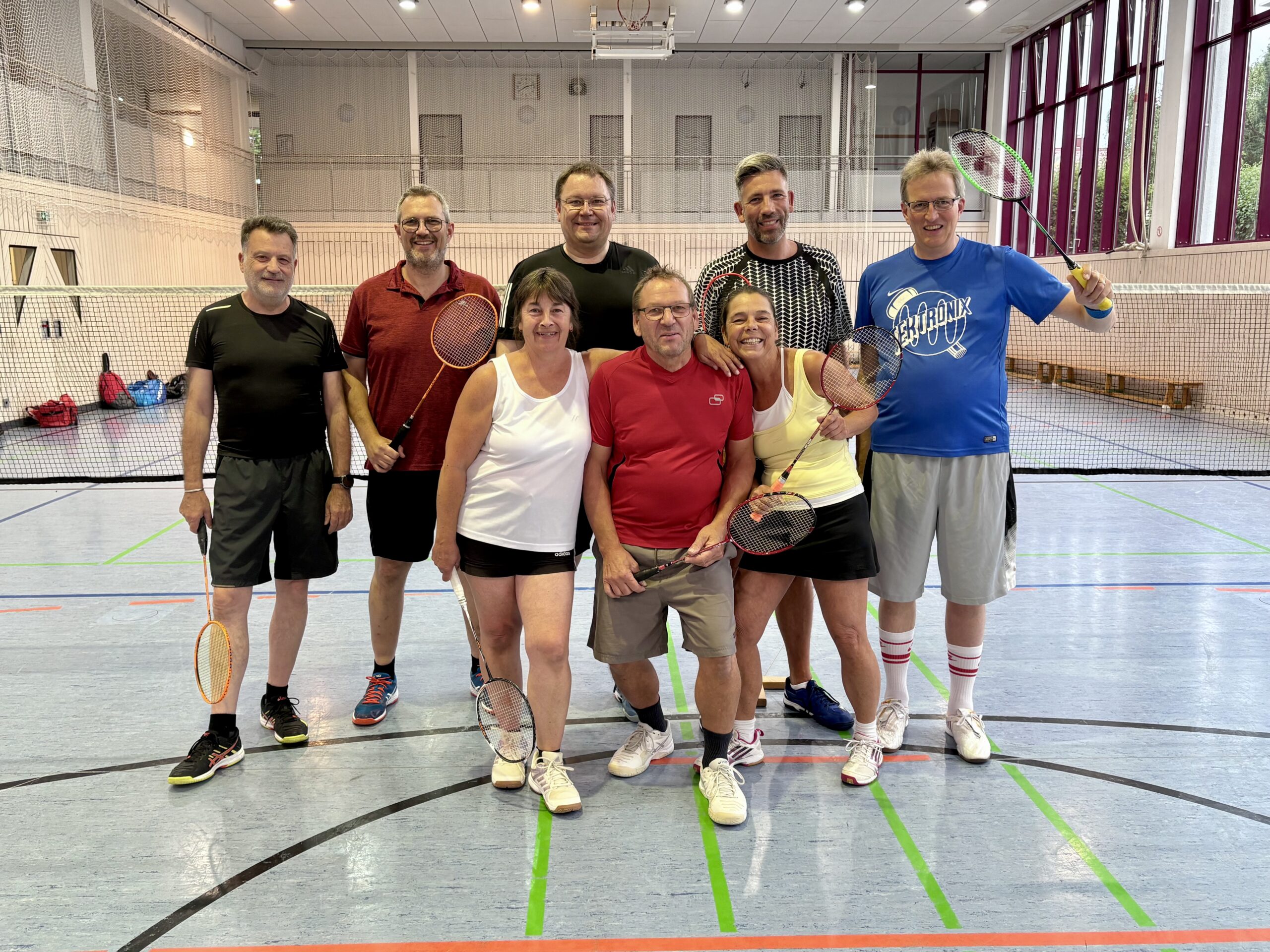 Jeden Dienstag von 20 bis 22 Uhr spielt die Badminton-Gruppe auf maximal drei Feldern. Wir sind eine gemischte Freizeitgruppe und nehmen nicht an Rundenspielen teil. Unsere Übungsstunden starten mit Warmlaufen und einem Aufwärmtraining. Nach einem Schlagtraining kommt freies Spiel im Einzel sowie im Doppel.